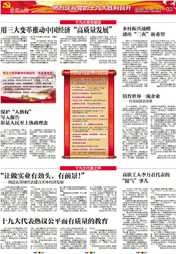 党的十九大报道,包头日报提前谋划,浓墨重彩。早在年初,包头日报就明确了全年新闻工作要紧紧围绕迎接、宣传、贯彻党的十九大这条主线,提前谋划,把脉定调,环环相扣,层层深入。从4月份开栏的“撸起袖子加油干”,到 5月份开启的“砥砺奋进的五年”大型系列策划报道,再到9月份推出的“喜迎十九大”和10月份的“十九大时光”的重磅专栏,《包头日报》每开设一个迎接十九大的专栏,都配发《编者按》。十九大期间,包头日报开设了“十九大时光”“党代表通道”“特别报道”“报告解读”“代表之声”“新华视点”等栏目12个,共推出大会报道36个版,刊发文稿百余条、图片20多幅,稿件编发全面及时、重点突出、亮点纷呈。