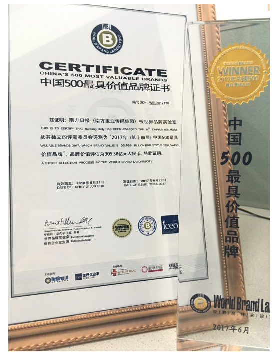 图表 1:南方日报品牌价值位列全国平面媒体第3位。