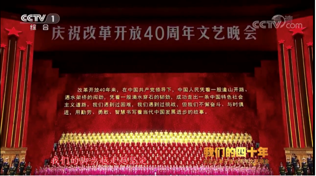 2018年12月18日,央视综合频道、综艺频道晚黄金时间同步播出《我们的四十年——庆祝改革开放40周年文艺晚会》。