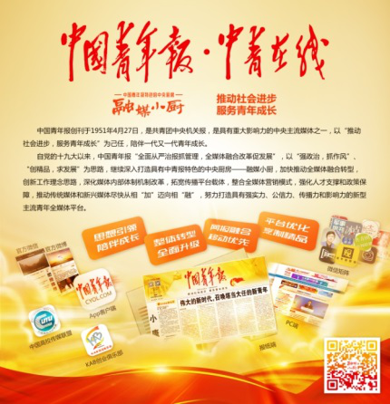 中国青年报创刊于1951年4月27日,是共青团中央机关报,是以青年为主要用户(读者)、具有重大影响力的中央主流媒体。中国青年报始终秉承“推动社会进步,服务青年成长”的办报宗旨,报纸端、PC端和移动端用户3000万,新闻转载率居全国平面媒体前列。