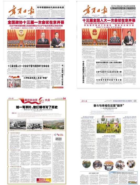 在全国两会报道中,宁报集团报网端微融合传播,精准传达中国方略,精彩传播宁夏声音。《宁夏日报》每天拿出4-5个整版报道全国两会盛况,刊发的稿件《让创新因子融入每个人的血脉——代表委员关注的那些事之一》。宁夏新闻网首页开辟“习近平总书记报道专区”,及时推送习近平总书记在全国两会上的最新报道。宁夏日报客户端推出的H5产品《换个姿势看宪法改了些啥》,采用动态触摸形式,直观形象地让新宪法飞入寻常百姓心。