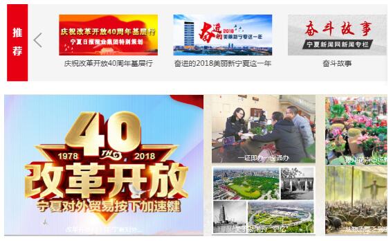 在改革开放40周年报道中,对中国,尤其对宁夏40年来的巨大变迁和辉煌成就进行了全景式扫描,多角度呈现。宁报集团各媒体开设“壮阔东方潮 奋进新时代”等专栏专题,推出《40年,感受伟大变革中的历史温度》等系列报道,从百姓衣食住行变化,呈现宁夏波澜壮阔的改革画卷。