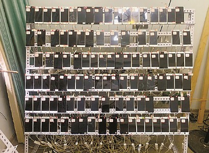 黑灰产人员使用的“手机墙”。 图片来源:温州瓯海区人民检察院