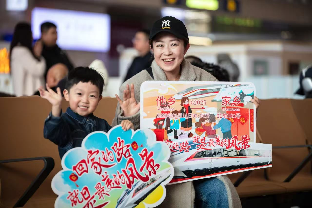 1月14日,在春运首日的沈阳站内,回家的母子打卡拍照。 沈阳站客运值班员高飞 摄
