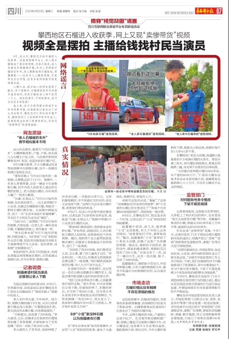 花了两周时间,我们顶着烈日实地走访了凉山州会理市、攀枝花市仁和区的石榴产区,结果发现这些所谓的热门视频无一例外都是虚假摆拍,是 “自媒体”账号所有者付费请村民当“演员”。其中,在各大社交平台上火爆并传播上亿次、感动众多网友的9岁男孩“小宝”和奶奶卖石榴的“悲惨”故事,纯属编造。