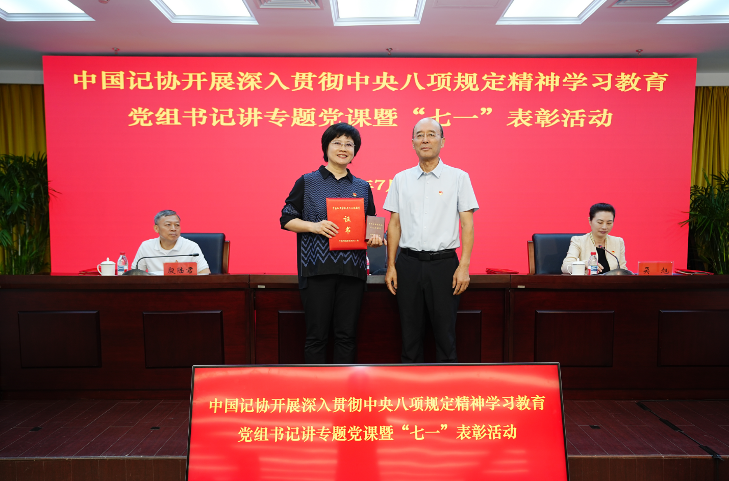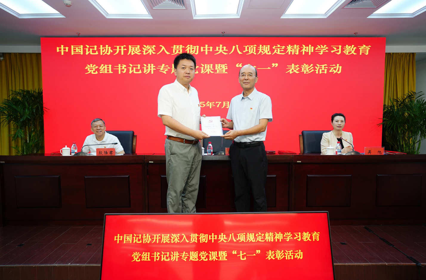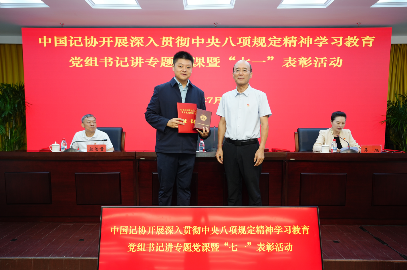 党课开始前,中国记协开展了“七一”表彰活动,宣读获得“光荣在党50年”纪念章老同志名单;向3名同志颁发“中央和国家机关‘四好’党员”证书、“中央和国家机关青年五四奖章”证书和奖章、“中央和国家机关三八红旗手”证书和奖章,表彰获“中央和国家机关‘四强’党支部”称号的党支部;表彰中国记协“四好”党员并颁发荣誉证书。
