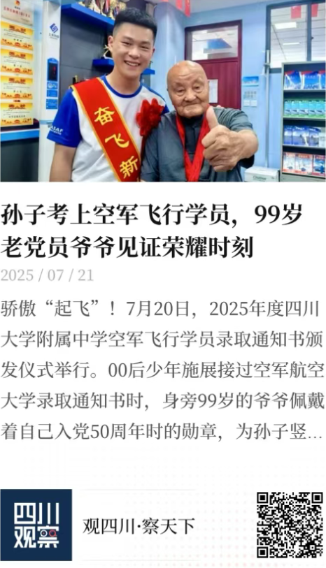 四川广播电视台:《孙子考上空军飞行学员,99岁老党员爷爷见证荣耀时刻》
