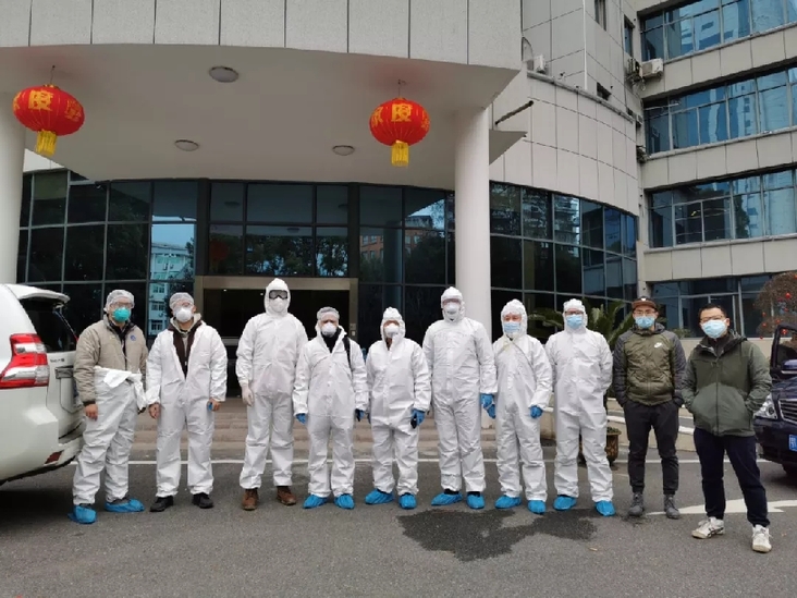 2月8日,新华社武汉前方报道组出发报道方舱医院武汉客厅院区,在新华社湖北分社前合影。