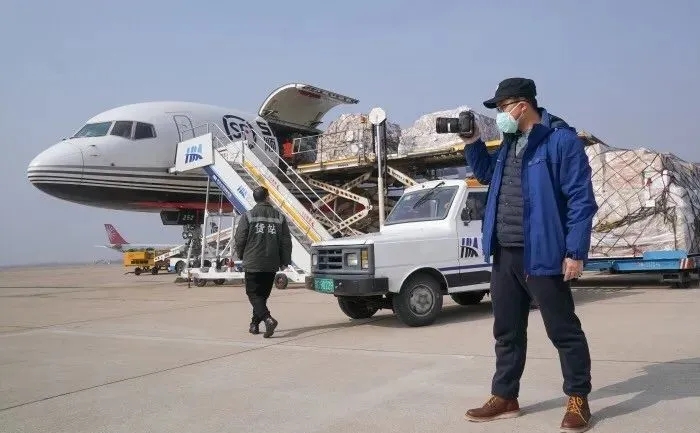1月28日,新华社湖北分社记者潘志伟在武汉天河机场采访抢运救灾物资。程敏 摄