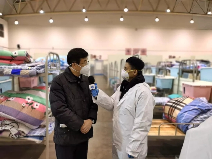 1月27日,新华社记者王作葵(左)在汉口医院采访海军军医大学医疗队医生。