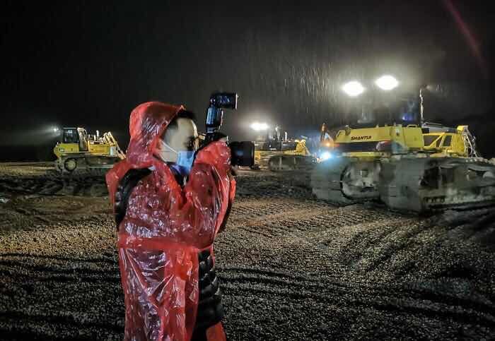 1月25日,新华社记者肖艺九冒雨在武汉火神山医院建设工地采访。