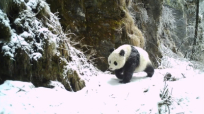 2021年3月1日在四川绵阳大熊猫国家公园北川小寨子沟片区用红外相机拍摄的野生大熊猫。大熊猫冒雪前行的姿态生动呆萌,令人倾心。