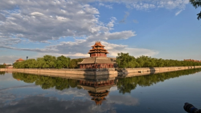 2023年6月11日,一场阵雨过后,在蓝天白云映衬下的北京故宫角楼,照片左右对称的画面很有气势,碧空如洗,给观者带来心旷神怡的感受。